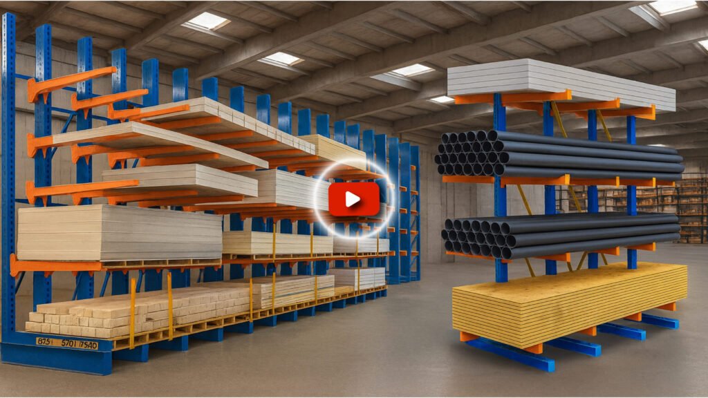 Cantilever racks provide strong, flexible storage for long or bulky items like pipes, lumber, and steel bars. Their open-front design allows easy loading and quick access.